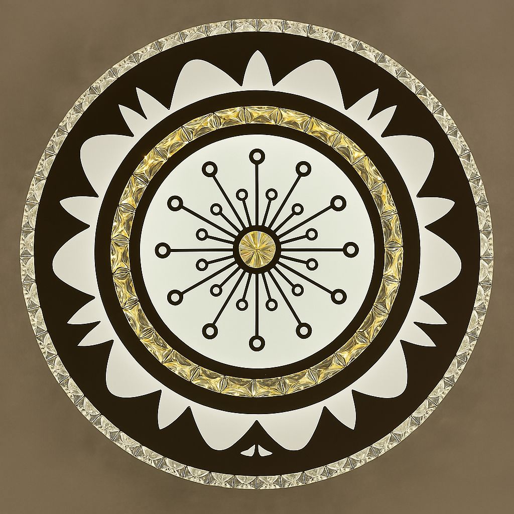 Dale vida a tu techo con esta espectacular lámpara plafón decorativa modelo SJ2004, ideal para espacios donde el diseño y la elegancia se encuentran. Su estructura circular con detalles gráficos y bordes en cristal brillante la convierten en una pieza moderna y única para tu hogar.