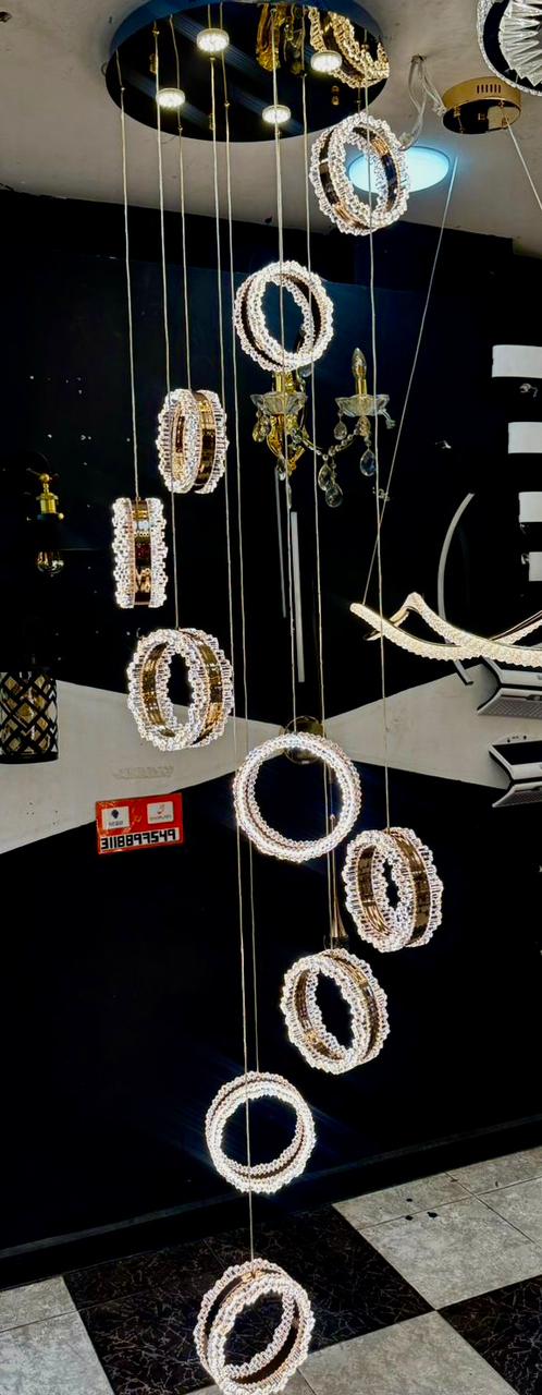 Dale un toque moderno y sofisticado a tus espacios con esta espectacular lámpara colgante de 10 aros. Ideal para ambientes amplios y con diseño contemporáneo.