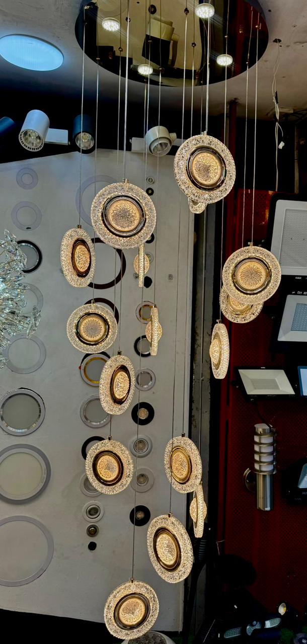 Con un diseño decorativo imponente, esta lámpara de 16 aros transforma cualquier espacio en una verdadera obra de arte.