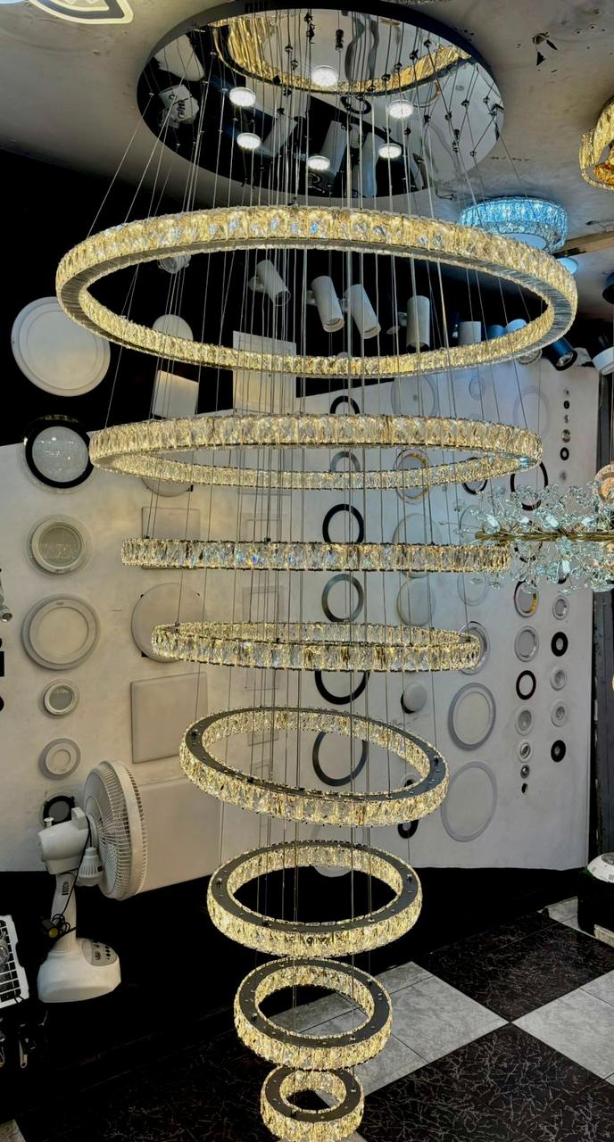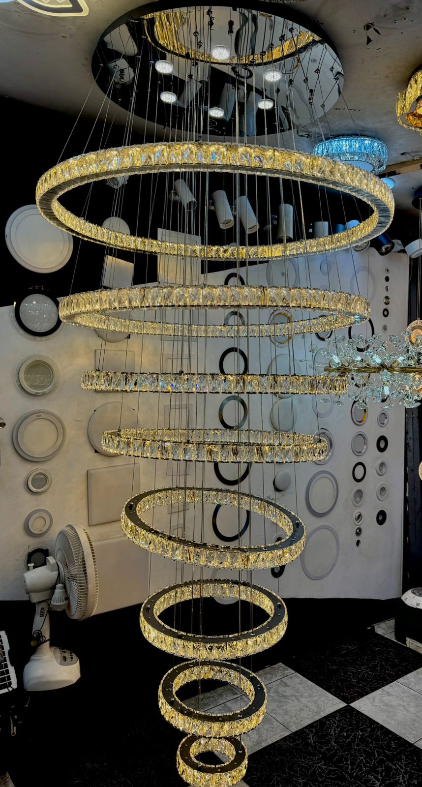 Una lámpara imponente y minimalista pensada para techos altos. Su diseño flotante con 8 aros crea un ambiente moderno y acogedor.