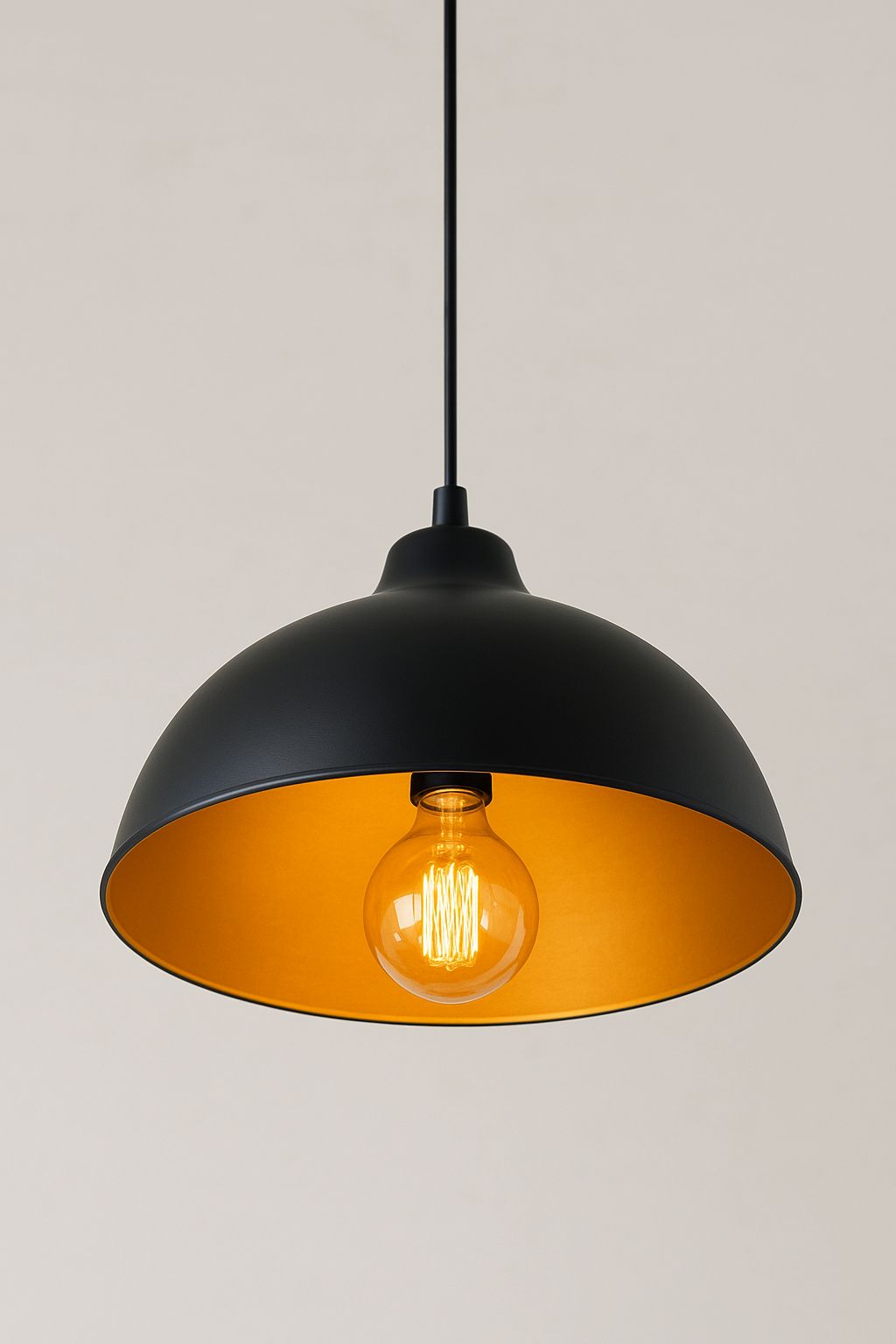 ✨ Esta campana colgante de 40 cm combina un elegante exterior negro mate con un interior dorado metálico que realza la luz y añade calidez al ambiente. Perfecta para quienes buscan impacto visual con un diseño moderno e industrial.