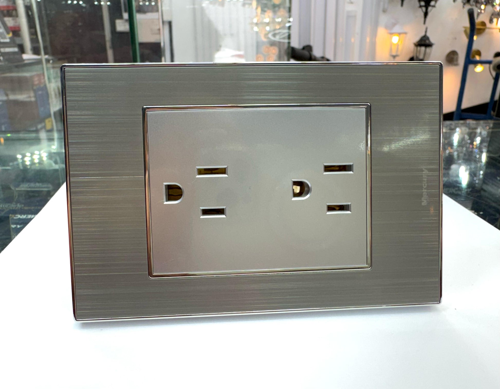 ⚡ La toma doble Premium Stainless ofrece dos salidas de corriente en un diseño contemporáneo de color acero satinado, ideal para complementar ambientes residenciales, corporativos o comerciales de alto nivel.